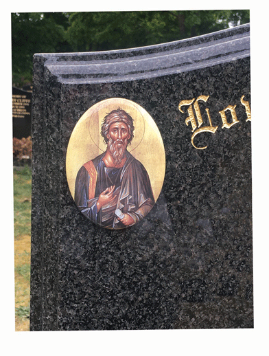 Große, in den Granit eingelassene Plaketten wie das abgebildete Exemplar des Motorrads. Das religiöse Design wird mithilfe unseres einzigartigen Technologieverfahrens auf den Granit gedruckt.